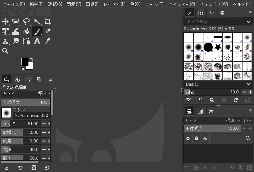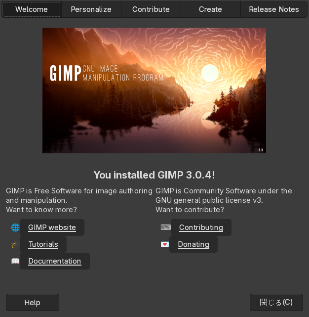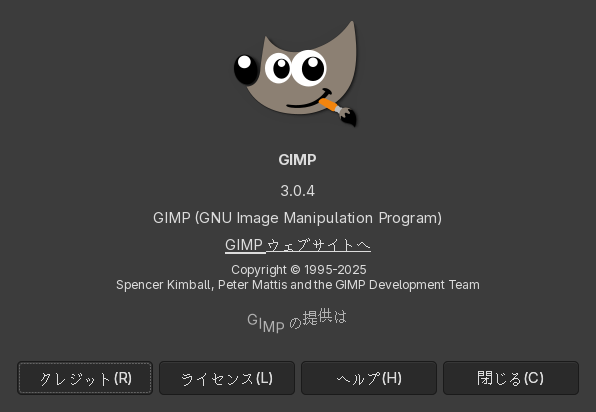 「閉じる」 起動直後の状態です。 2025年9月18日の時点で、下記のバージョンでした。 操作については、「画像編集ソフト GIMP」に掲載しています。 上記は簡単なものですので、詳細なものがほしい方は、各所に初歩の手引きから応用編までありますので、そちらを参考にしてください。 |