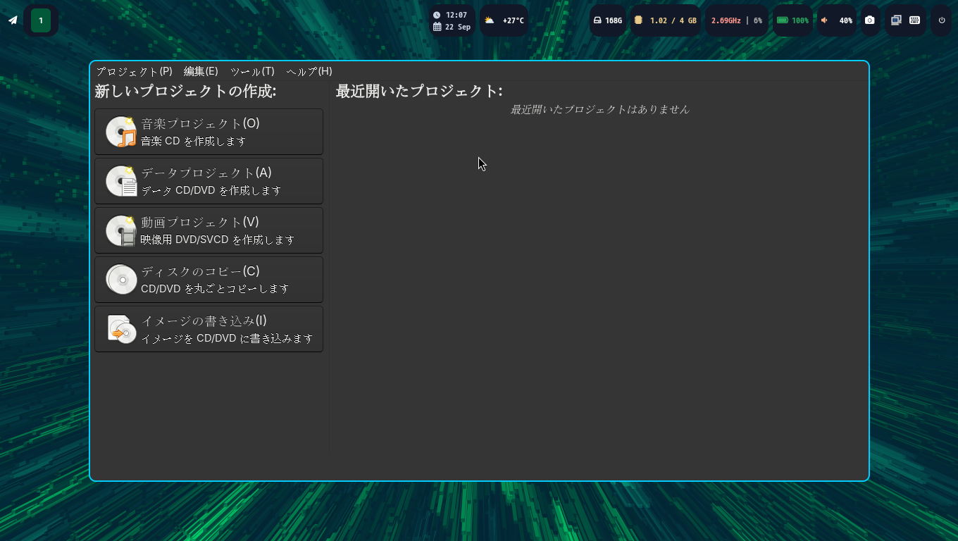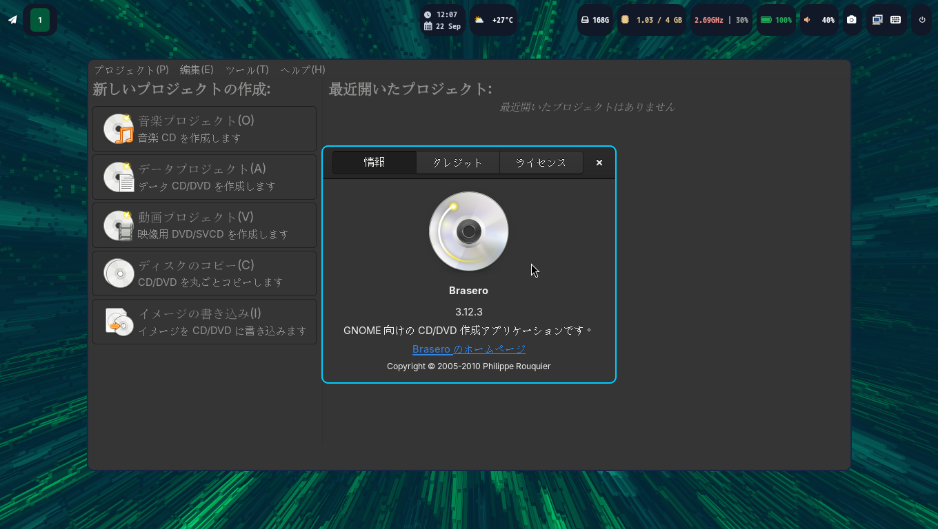 1. 概要 光ディスクライティングソフトとして、「Brasero」を使用します。 2. インストール 「Pamac」で、「brasero」を検索して、インストールします。 3. 起動 「スタート」→「マルチメディア」→「Brasero」