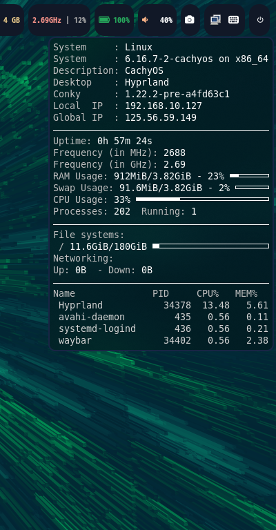 ログイン後、デスクトップ右に、「Conky」の表示が現れます。
