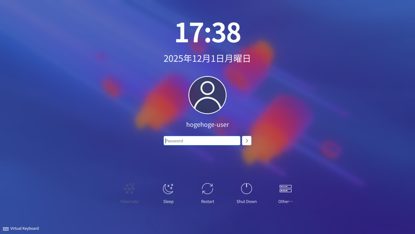 ログイン画面が表示されれば、インストールは、完了です。 インストール時は、「Plasma(Wayland)」「Plasma(X11)」の選択肢がありましたが、インストール後は、「Plasma(Wayland)」へしかログインできないようです。 |