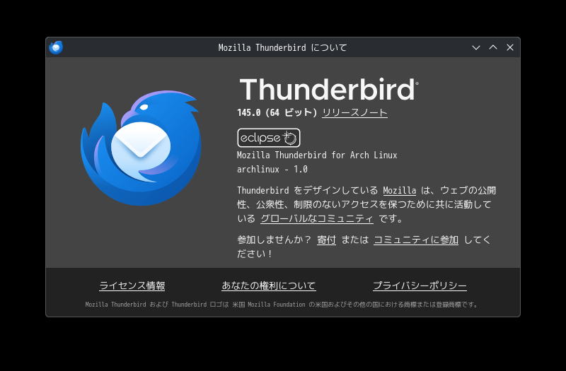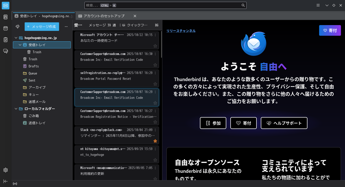 初回起動時は、「アカウント設定」が起動します。 起動直後に、受信ボックスを開いた状態です。 2025年12月1日の時点で、下記のバージョンでした。 操作方法等は「メール クライアント ソフト - Thunderbird」をご参照ください。 |