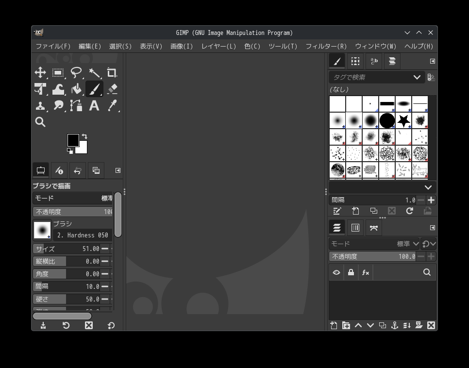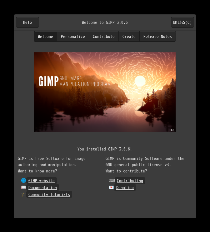 「閉じる」 起動直後の状態です。 2025年12月2日の時点で、下記のバージョンでした。 操作については、「画像編集ソフト - GIMP」に掲載しています。 上記は簡単なものですので、詳細なものがほしい方は、各所に初歩の手引きから応用編までありますので、そちらを参考にしてください。 |
