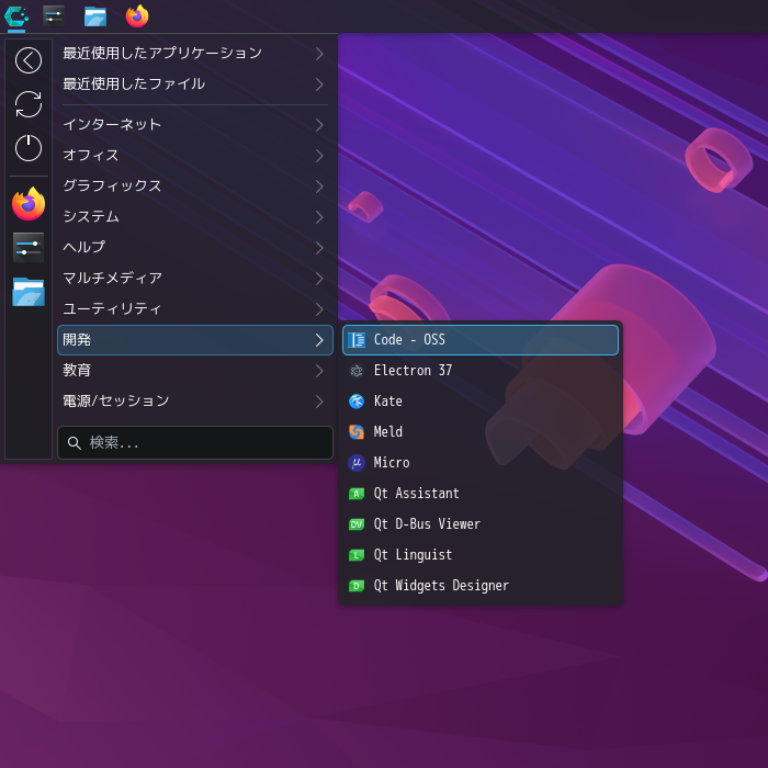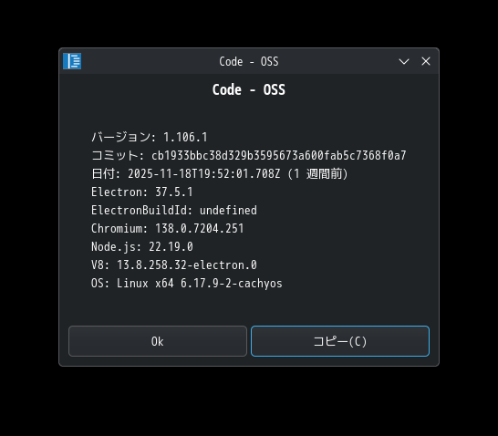 1. 概要 開発環境として、「Visual Studio Code」を使用します。 2. インストール 「CachyOS Package Installer」で、「vscode」を検索して、インストールします。 3. 起動 「スタート」→「開発」→「Code OSS」