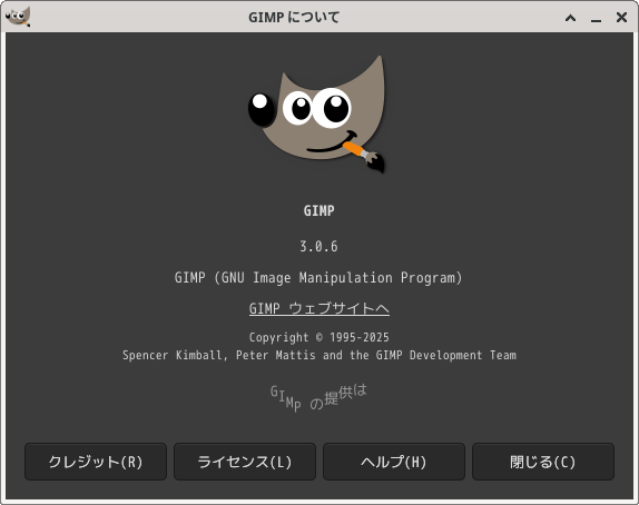 「閉じる」 起動直後の状態です。 2025年12月4日の時点で、下記のバージョンでした。 操作については、「画像編集ソフト - GIMP」に掲載しています。 上記は簡単なものですので、詳細なものがほしい方は、各所に初歩の手引きから応用編までありますので、そちらを参考にしてください。 |