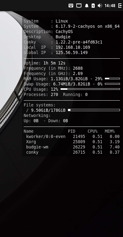 ログイン後、デスクトップ右に、「Conky」の表示が現れます。