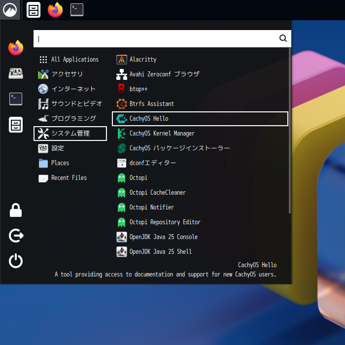 ログインするたびに「CachyOS Hello」というダイアログが表示されます。