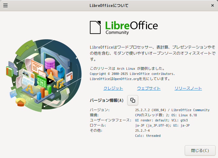 1. 概要 オフィススイートとして、「LibreOffice」を使用します。 2. インストール 「Pamac」で、「libreoffice-ja」を検索して、「libreoffice-still-ja」をインストールします。 3. 起動 「スタート」→「オフィス」→「LibreOffice」
