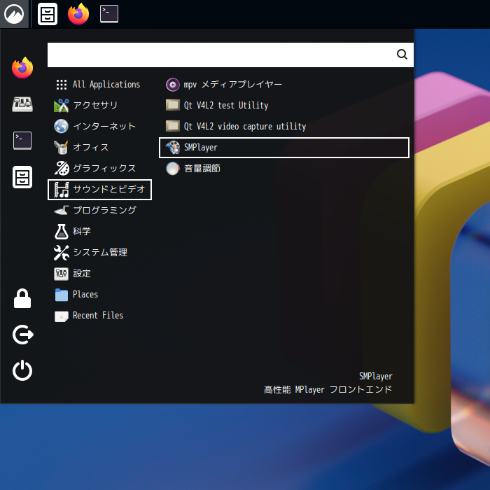 1. 概要 マルチメディアプレイヤーとして、「SMPlayer」を使用します。 2. インストール 「Pamac」で、「smplayer」を検索して、インストールします。 3. 起動 「スタート」→「サウンドとビデオ」→「SMPlayer」