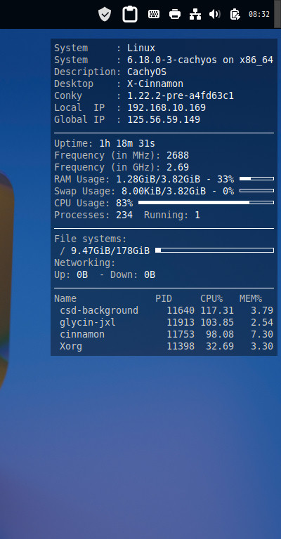 ログイン後、デスクトップ右に、「Conky」の表示が現れます。