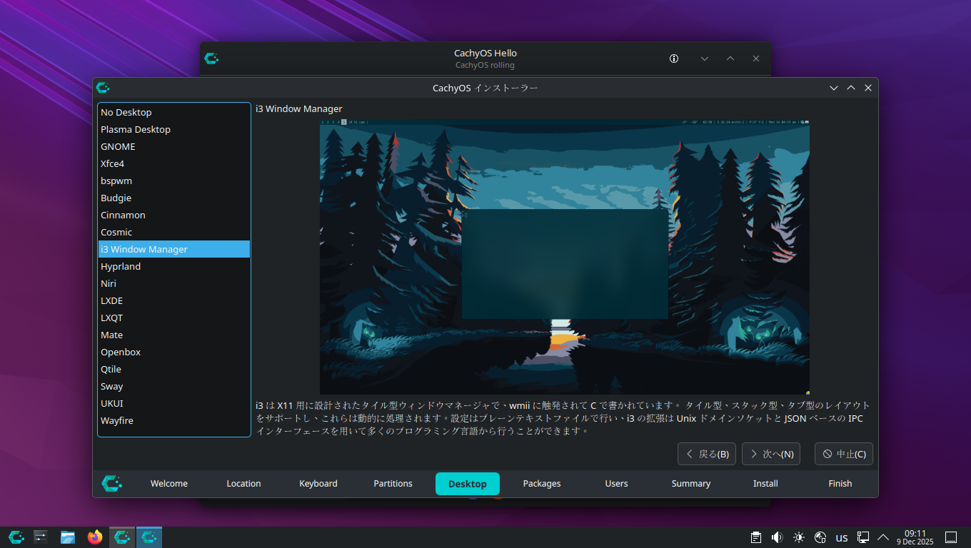 1. 概要 インストールに関しては、「CachyOS - 251129 - 共通事項」をご参照ください。 2. インストール インストール時に、デスクトップ選択画面で、「i3 Window Manager」を選択します。
