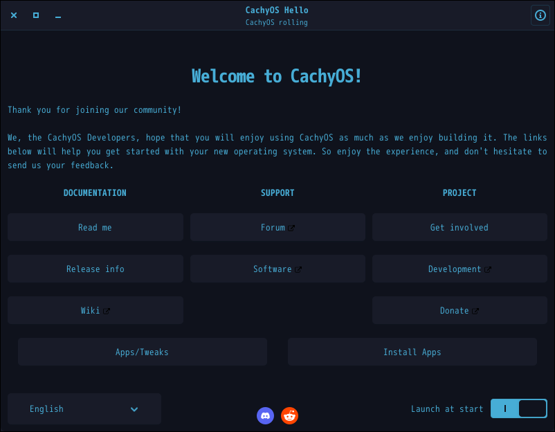 ログインするたびに「CachyOS Hello」というダイアログが表示されます。