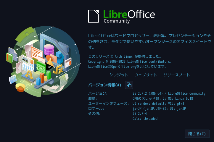 1. 概要 オフィススイートとして、「LibreOffice」を使用します。 2. インストール 「Pamac」で、「libreoffice-ja」を検索して、「libreoffice-still-ja」をインストールします。 3. 起動 「スタート」→「オフィス」→「LibreOffice」
