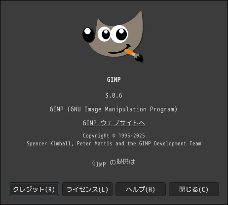 「閉じる」 起動直後の状態です。 2025年12月9日の時点で、下記のバージョンでした。 操作については、「画像編集ソフト - GIMP」に掲載しています。 上記は簡単なものですので、詳細なものがほしい方は、各所に初歩の手引きから応用編までありますので、そちらを参考にしてください。 |