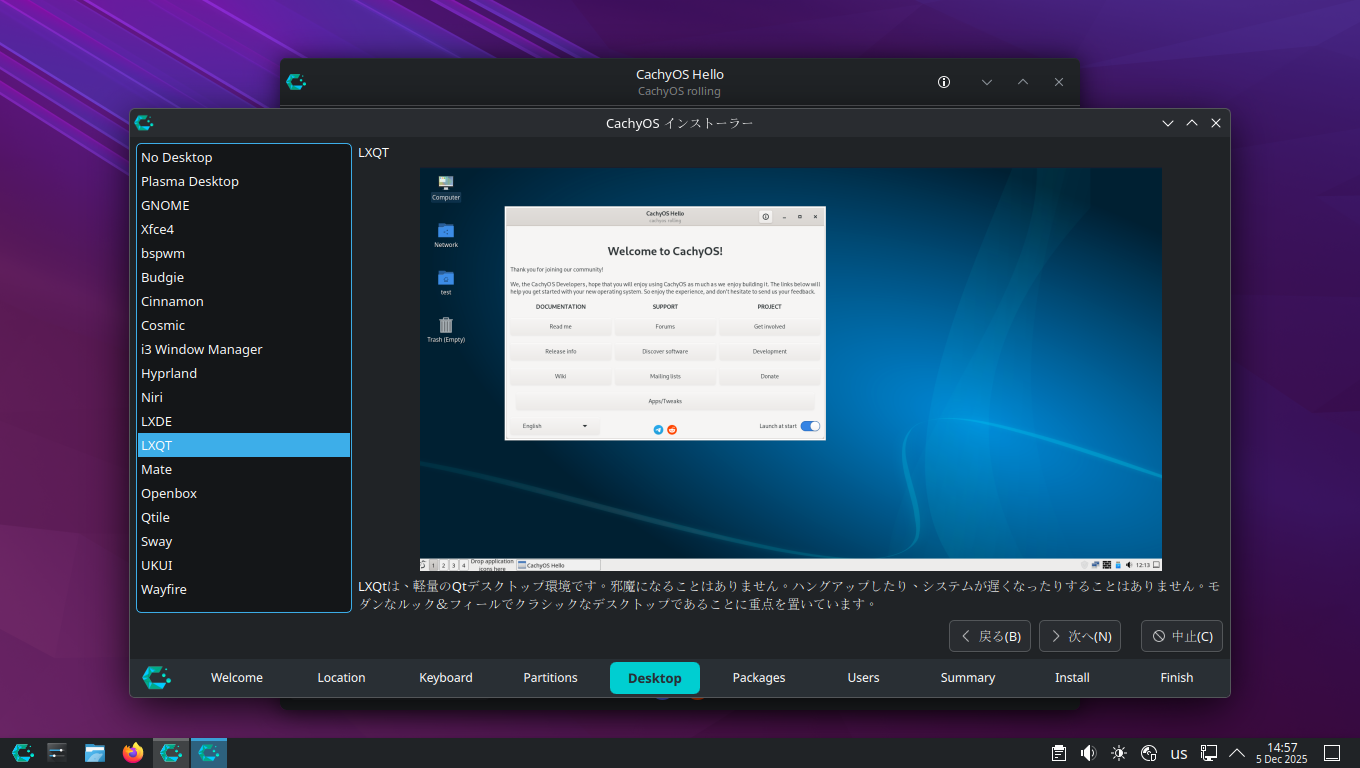 1. 概要 インストールに関しては、「CachyOS - 251129 - 共通事項」をご参照ください。 2. インストール インストール時に、デスクトップ選択画面で、「LXQt」を選択します。