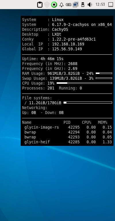ログイン後、デスクトップ右に、「Conky」の表示が現れます。