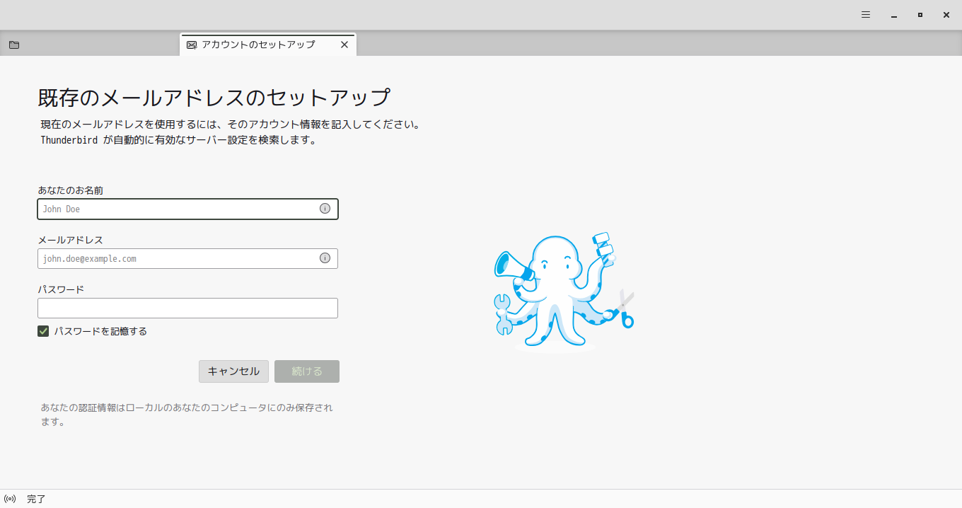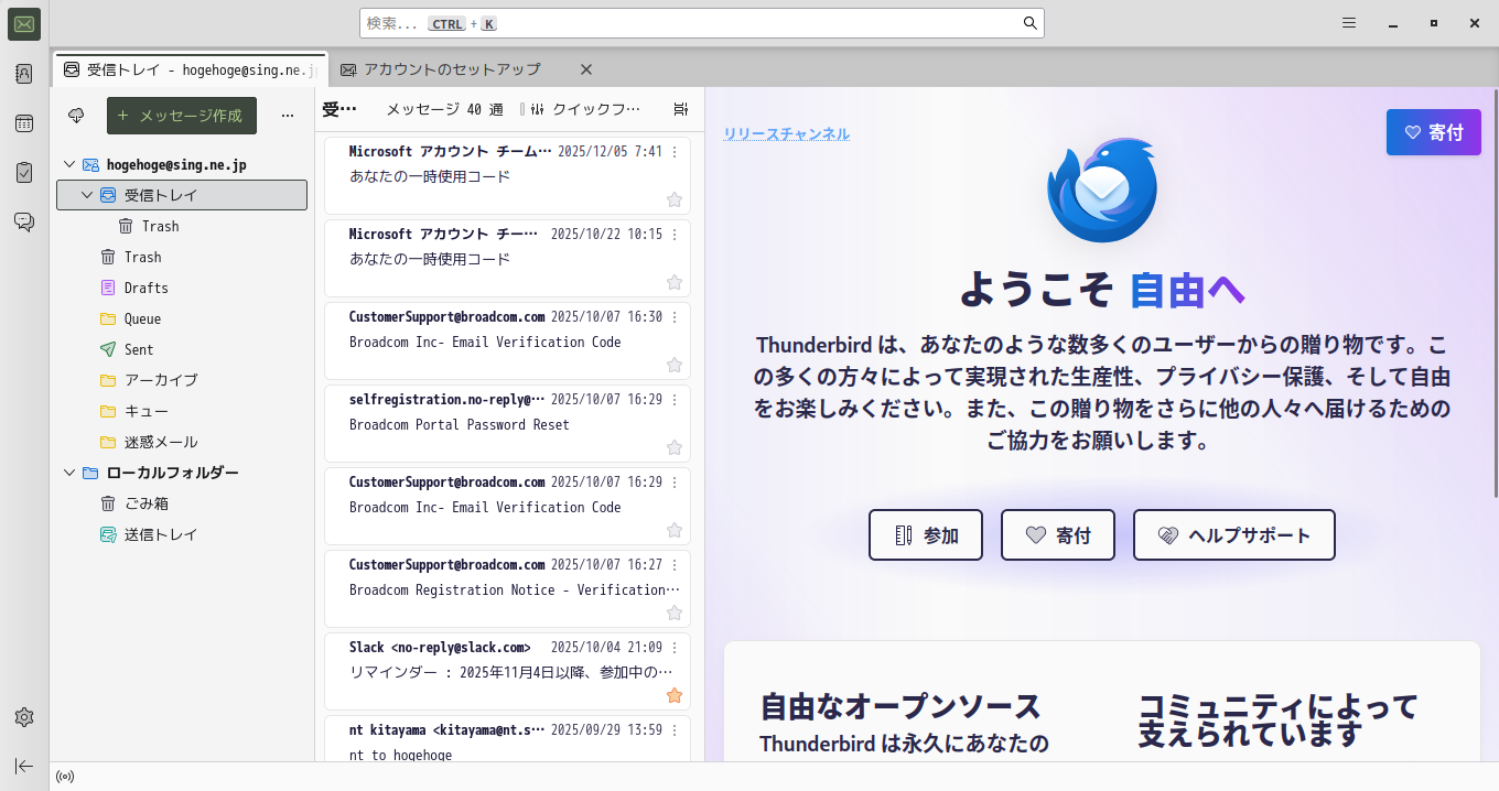 初回起動時は、「アカウント設定」が起動します。 起動直後に、受信ボックスを開いた状態です。 2025年12月15日の時点で、下記のバージョンでした。 操作方法等は「メール クライアント ソフト - Thunderbird」をご参照ください。 |