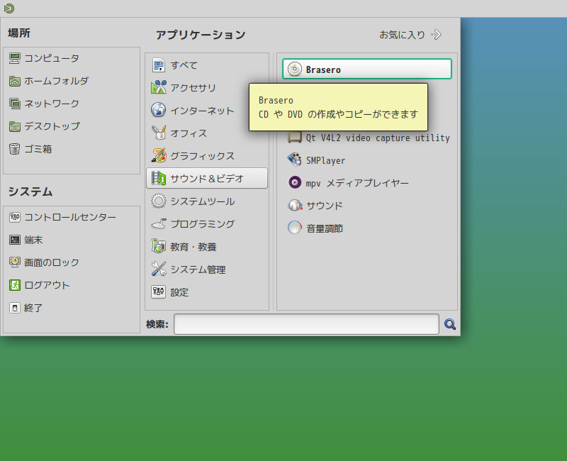 1. 概要 光ディスクライティングソフトとして、「Brasero」を使用します。 2. インストール 「Pamac」で、「brasero」を検索して、インストールします。 3. 起動 「スタート」→「サウンドとビデオ」→「Brasero」