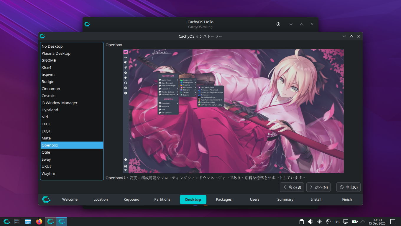 1. 概要 インストールに関しては、「CachyOS - 251129 - 共通事項」をご参照ください。 2. インストール インストール時に、デスクトップ選択画面で、「Openbox」を選択します。