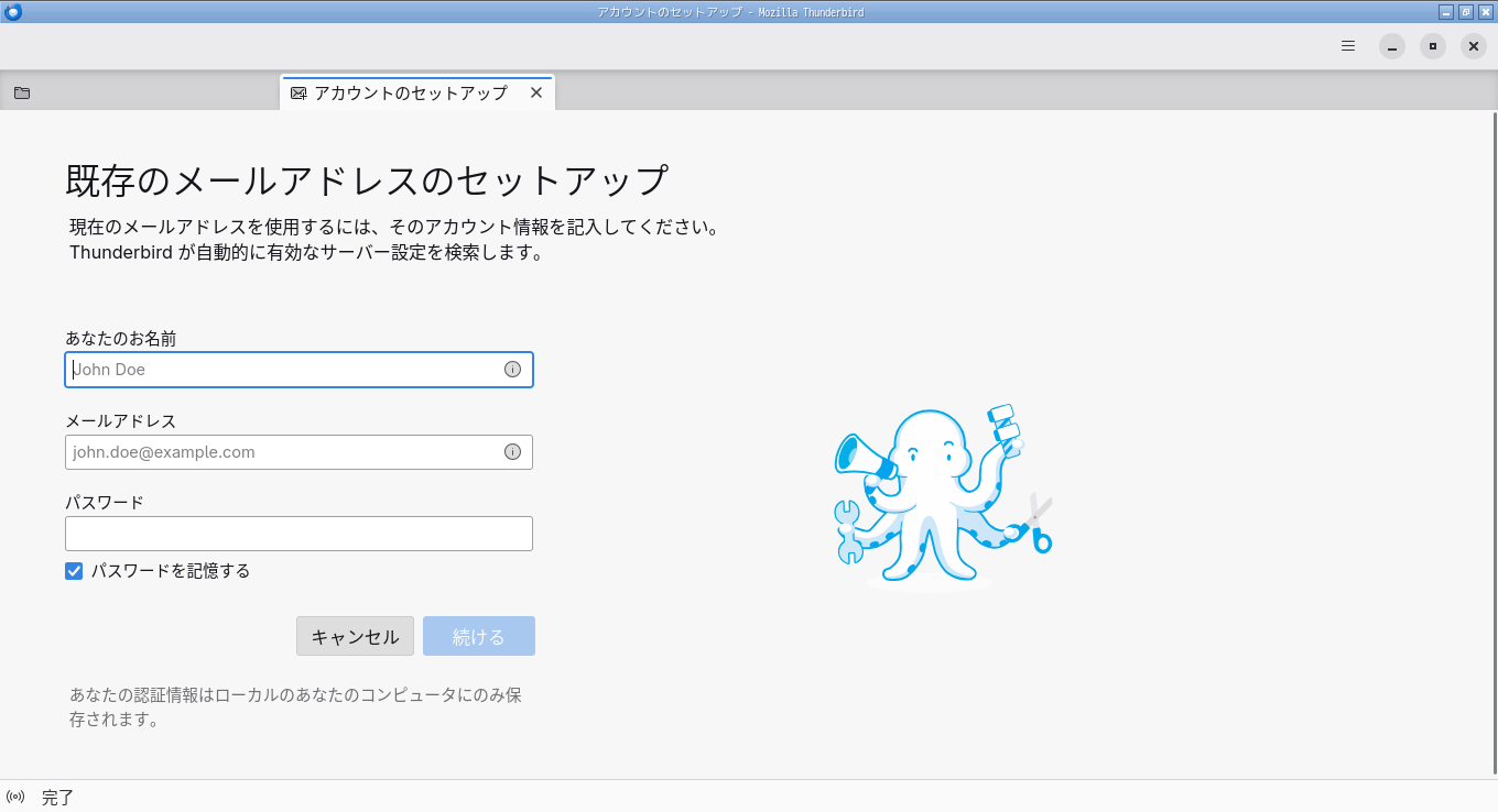 初回起動時は、「アカウント設定」が起動します。 起動直後に、受信ボックスを開いた状態です。 2025年12月15日の時点で、下記のバージョンでした。 操作方法等は「メール クライアント ソフト - Thunderbird」をご参照ください。 |