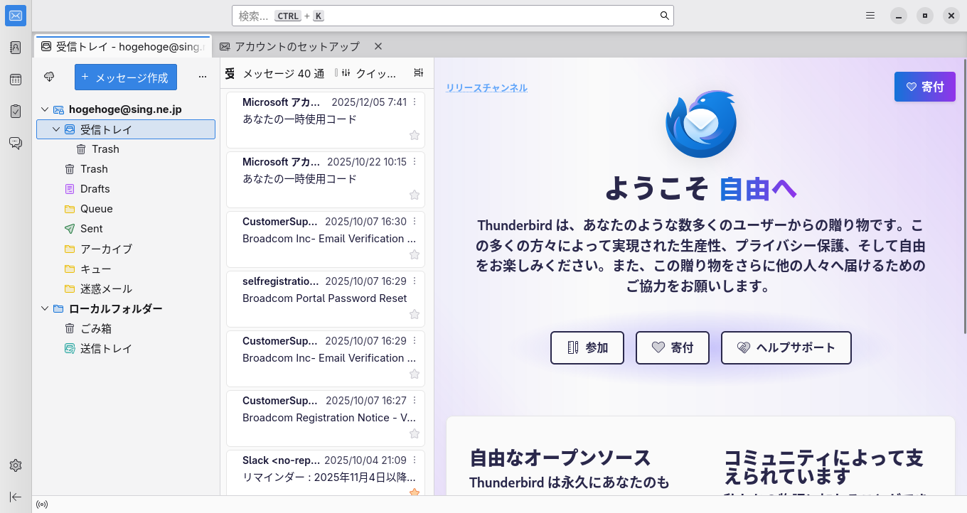 初回起動時は、「アカウント設定」が起動します。 起動直後に、受信ボックスを開いた状態です。 2025年12月16日の時点で、下記のバージョンでした。 操作方法等は「メール クライアント ソフト - Thunderbird」をご参照ください。 |