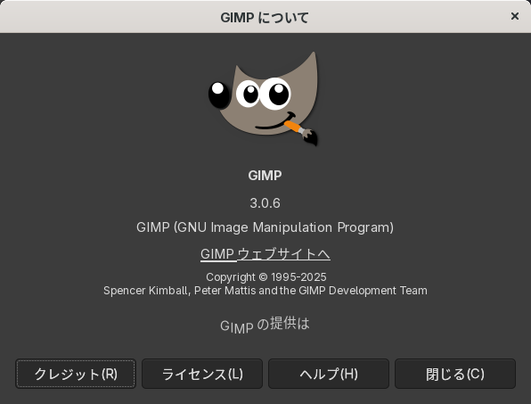 「閉じる」 起動直後の状態です。 2025年12月16日の時点で、下記のバージョンでした。 操作については、「画像編集ソフト - GIMP」に掲載しています。 上記は簡単なものですので、詳細なものがほしい方は、各所に初歩の手引きから応用編までありますので、そちらを参考にしてください。 |