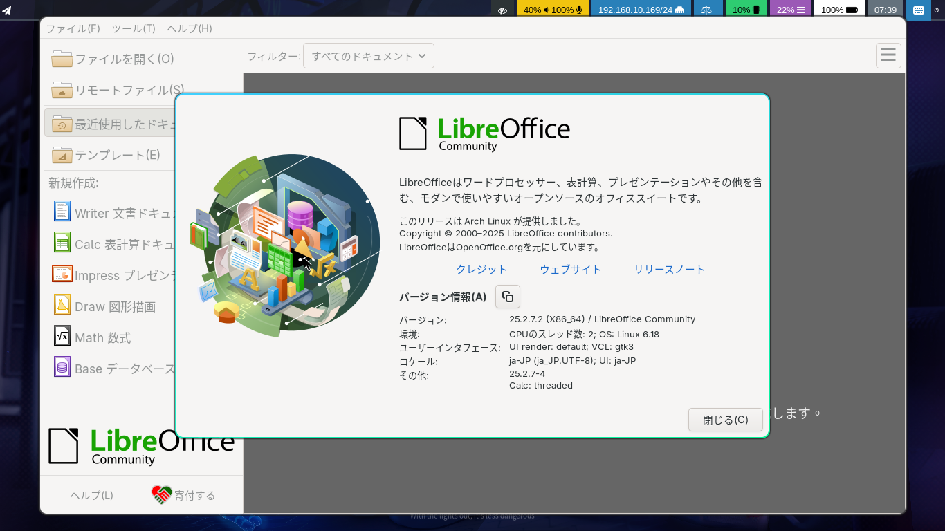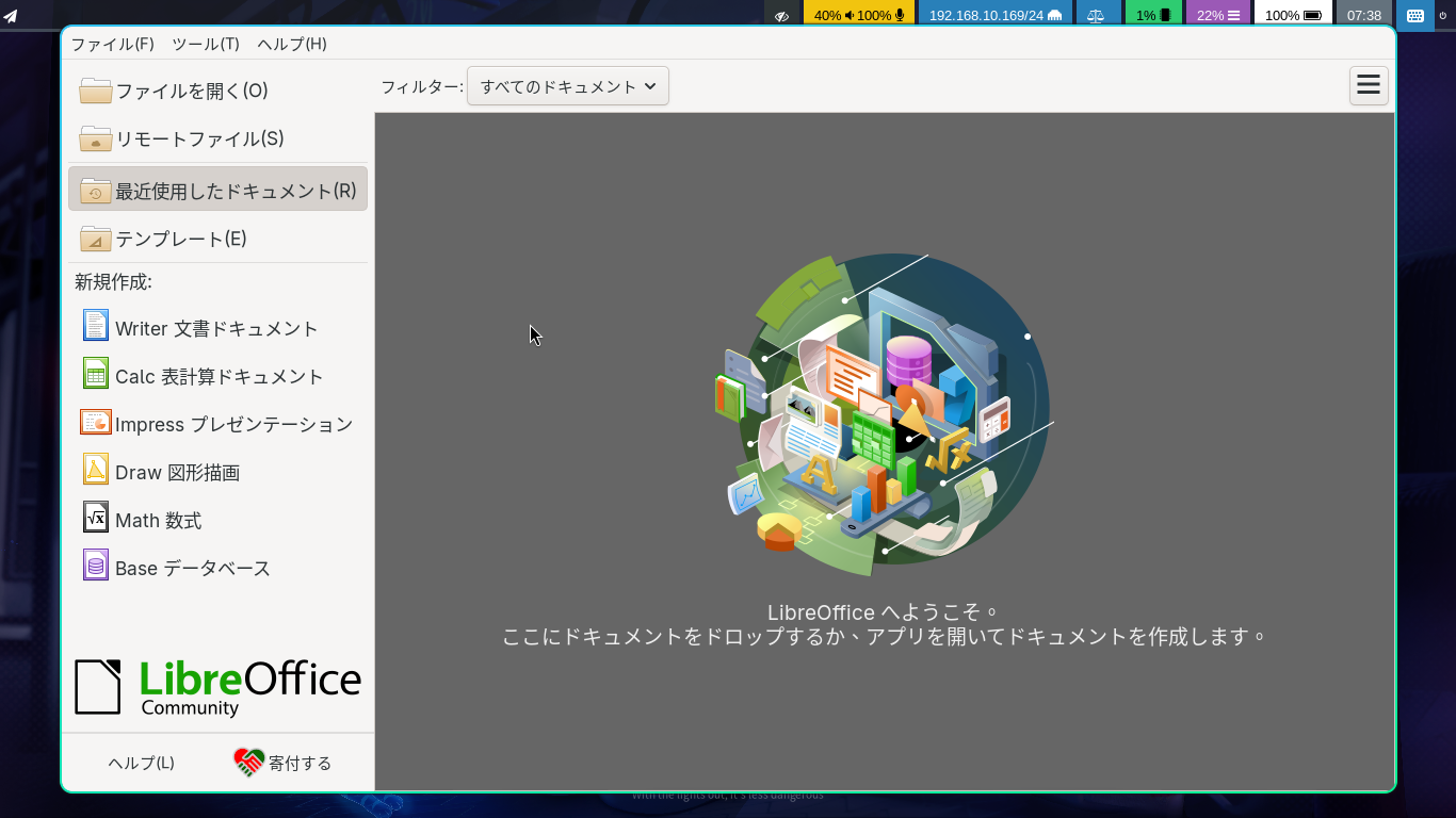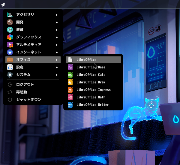 1. 概要 オフィススイートとして、「LibreOffice」を使用します。 2. インストール 「Octopi」で、「libreoffice-ja」を検索して、「libreoffice-still-ja」をインストールします。 3. 起動 「スタート」→「オフィス」→「LibreOffice」