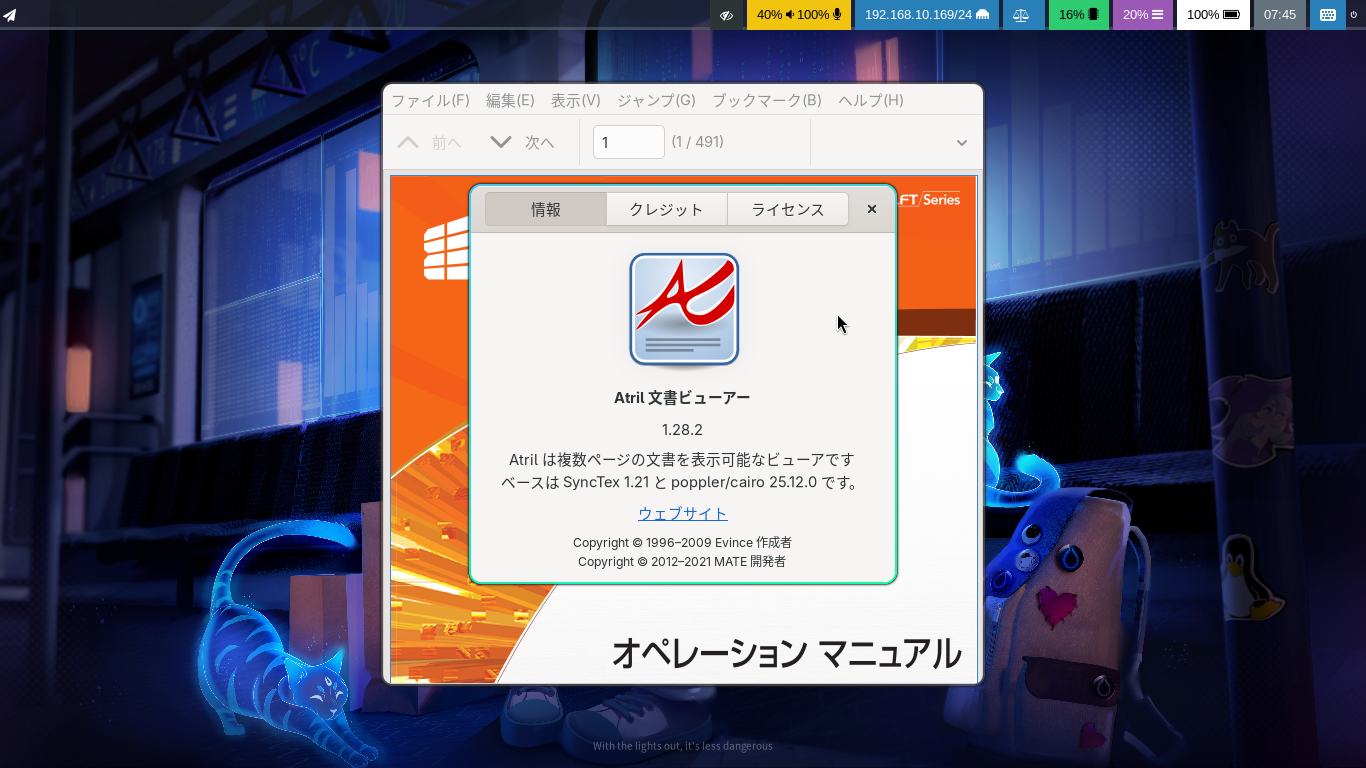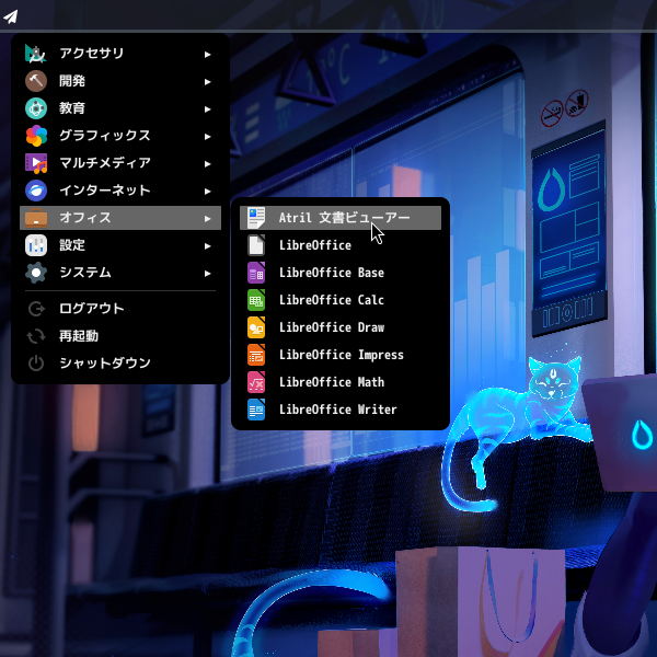 1. 概要 ドキュメントビューアとして、「Atril」を使用します。 2. インストール 「Octopi」で、「atril」を検索して、インストールします。 3. 起動 「スタート」→「オフィス」→「Atril 文書ビューア」