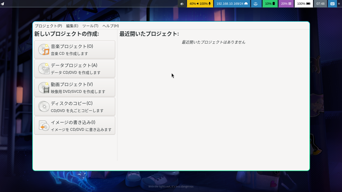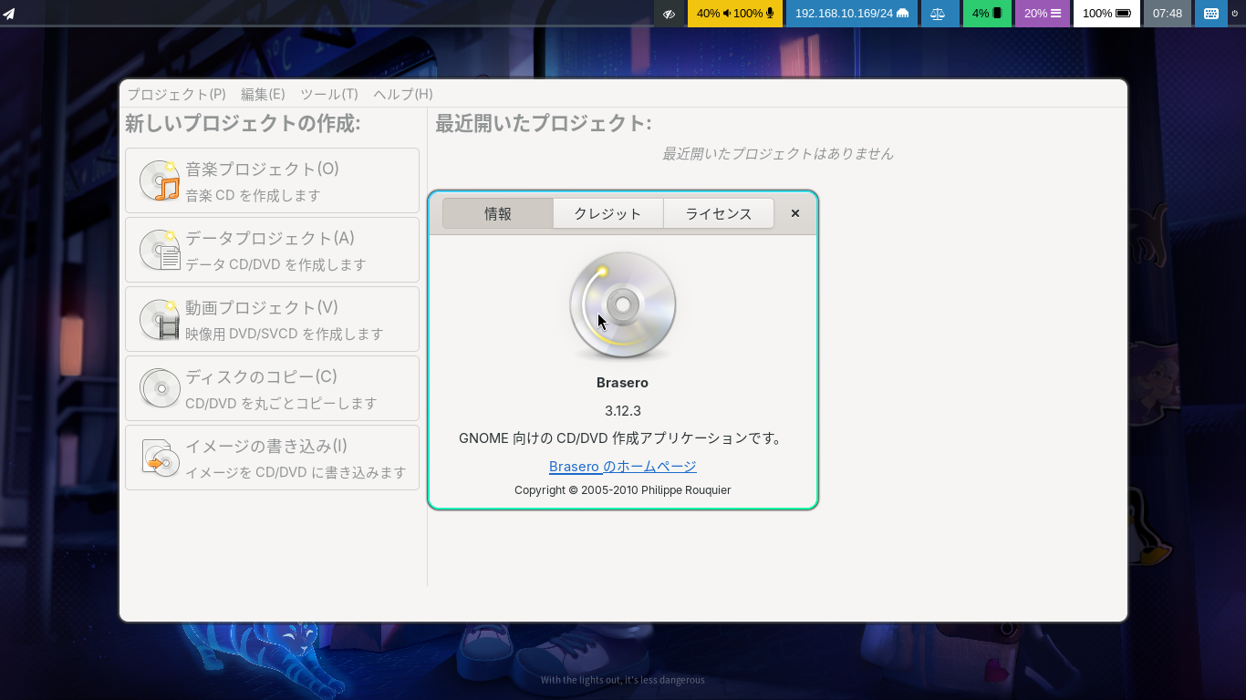 1. 概要 光ディスクライティングソフトとして、「Brasero」を使用します。 2. インストール 「Octopi」で、「brasero」を検索して、インストールします。 3. 起動 「スタート」→「マルチメディア」→「Brasero」