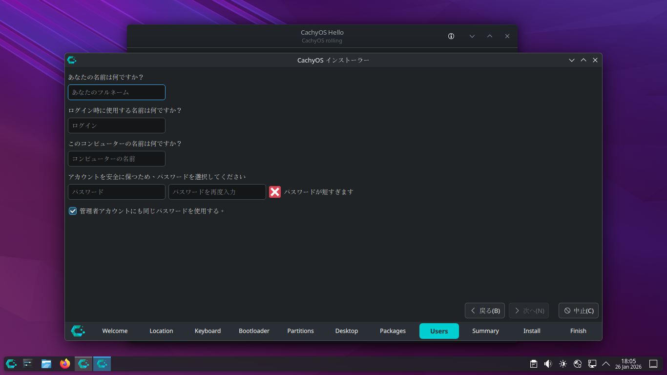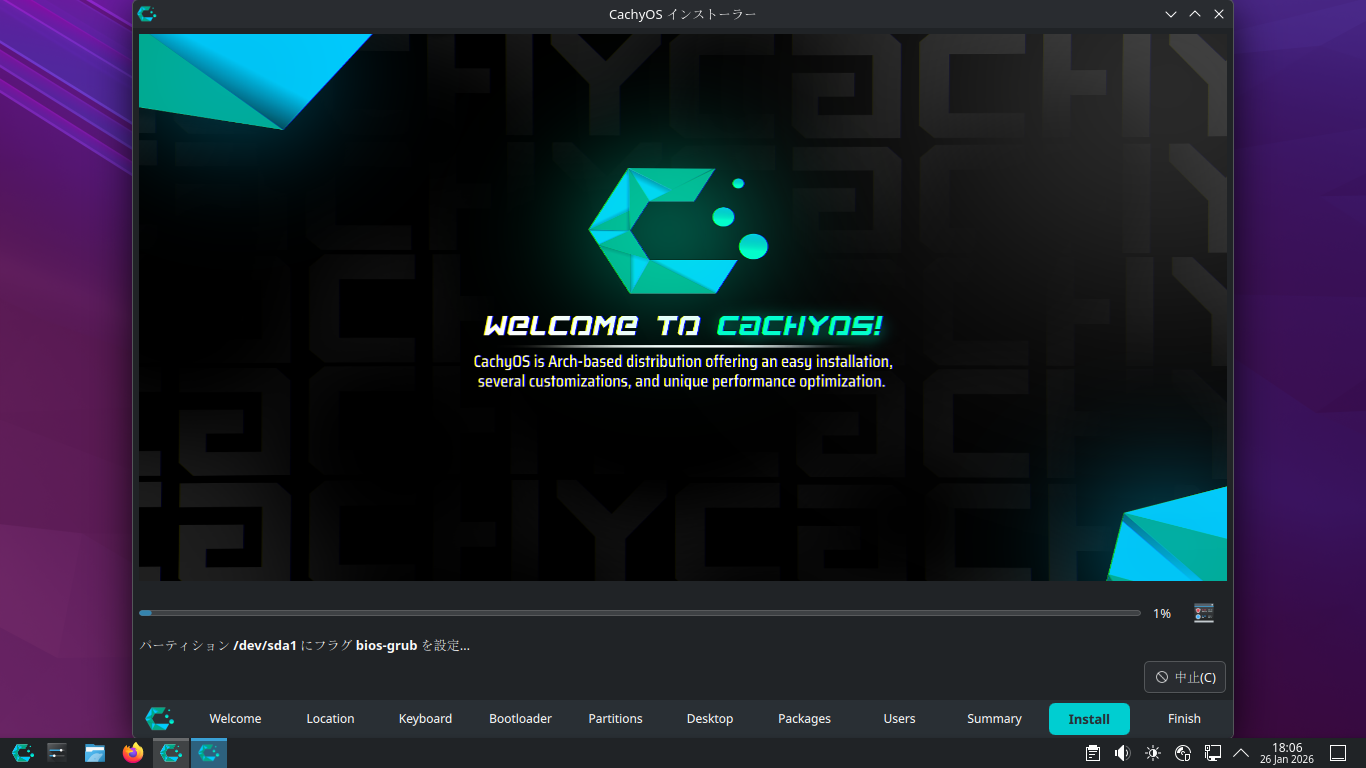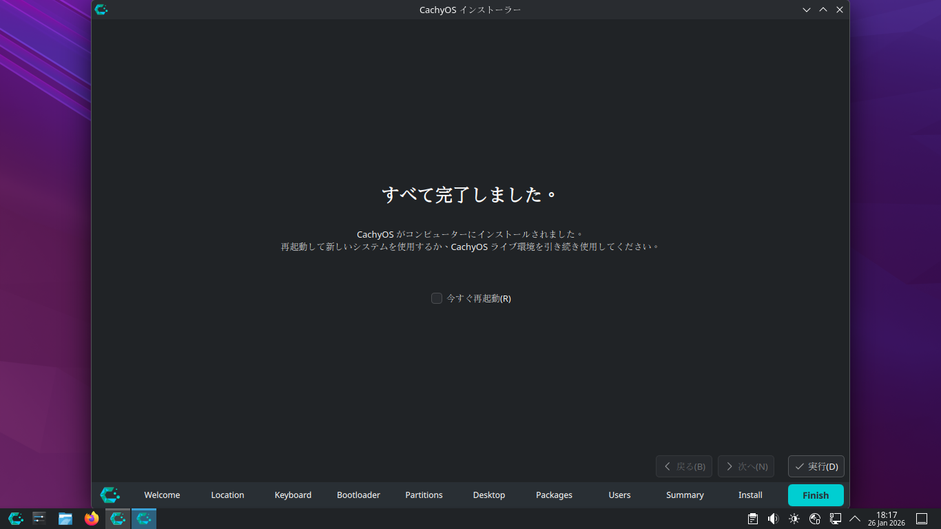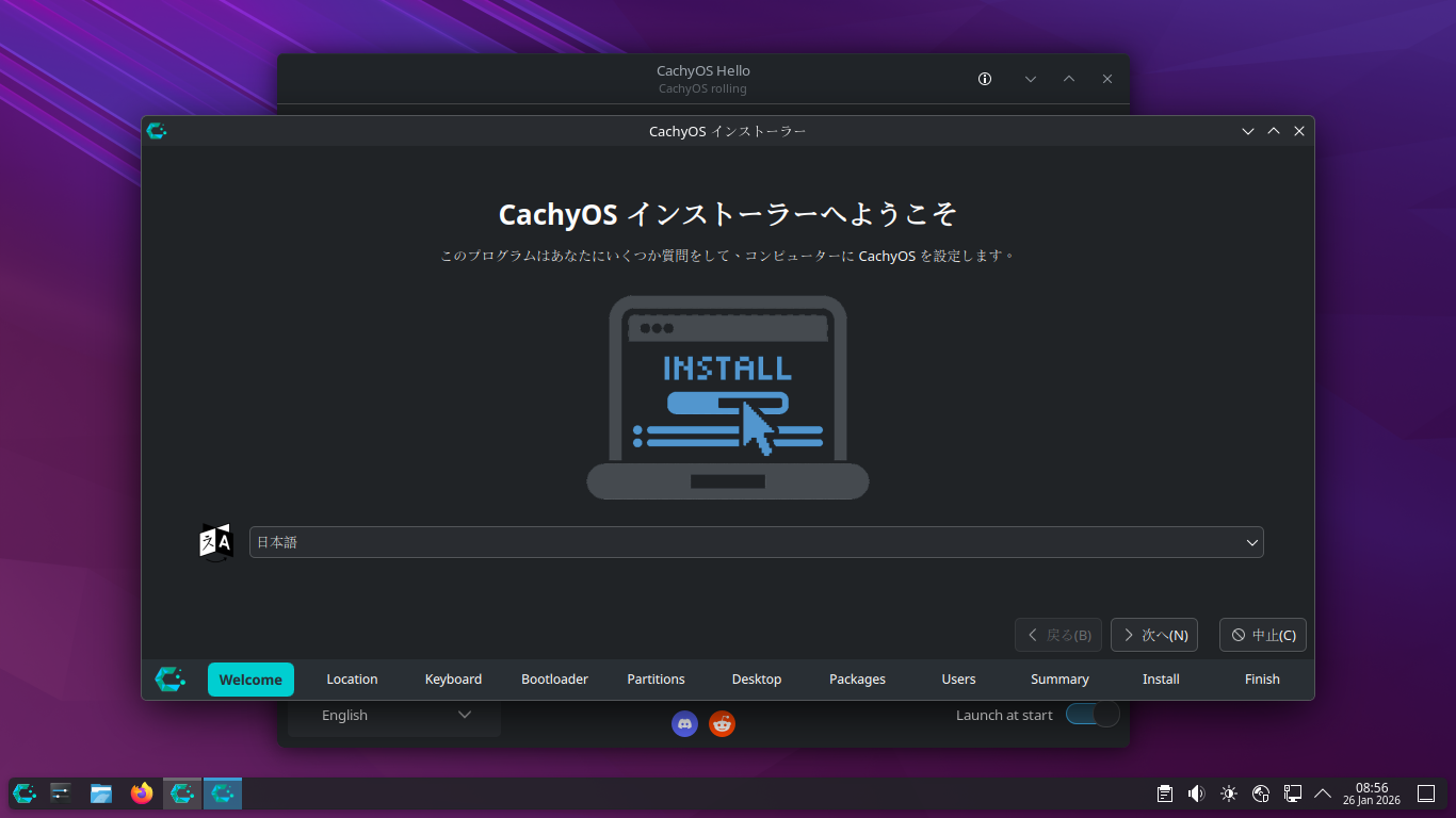 「CachyOS 251129」では、インストーラ起動時でも、ログインが必要でしたが、「CachyOS 260124」では、デスクトップ上で起動できました。