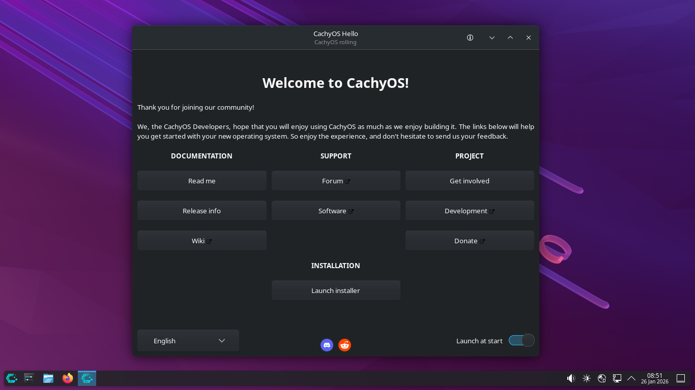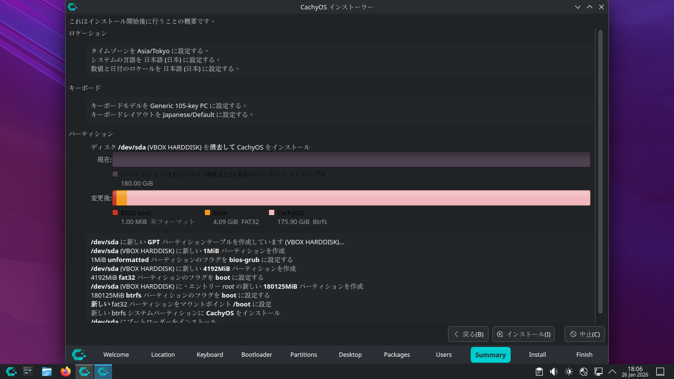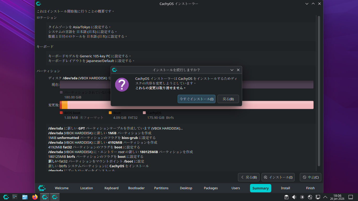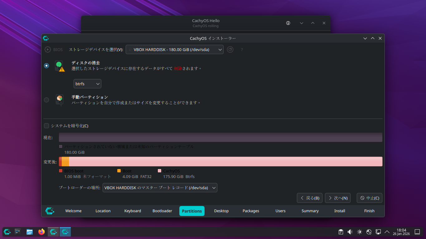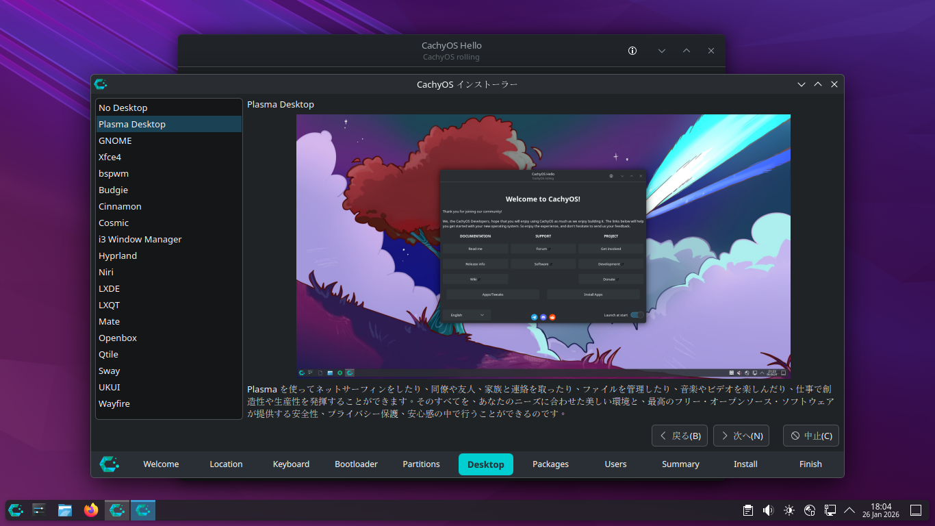 「CachyOS 251129」では、インストーラ起動時でも、ログインが必要でしたが、「CachyOS 260124」では、デスクトップ上で起動できました。