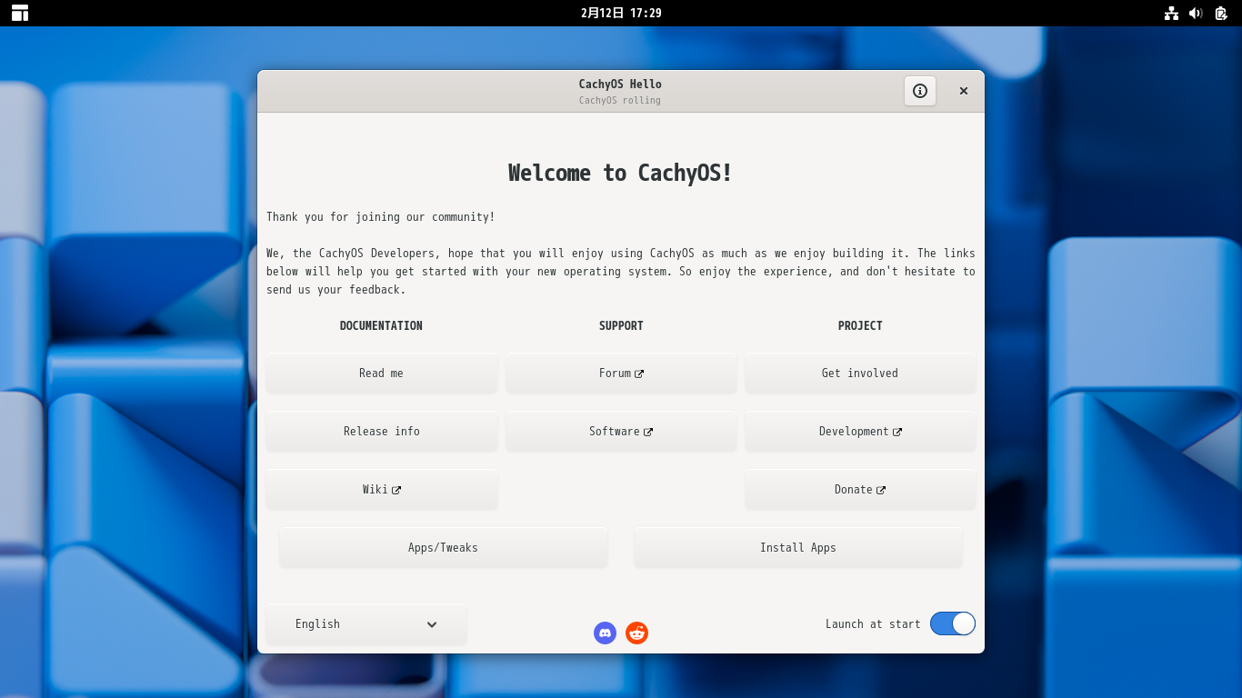 ログインするたびに「CachyOS Hello」というダイアログが表示されます。