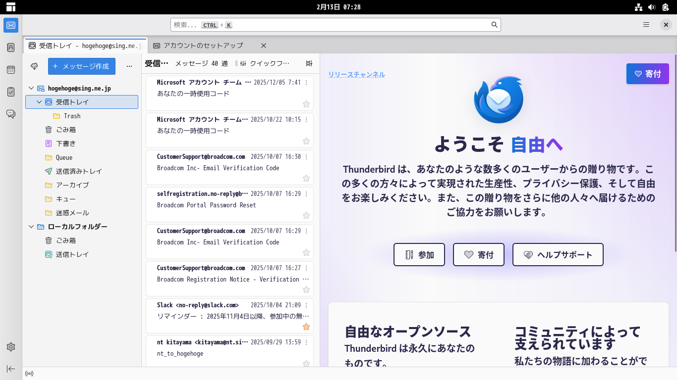 初回起動時は、「アカウント設定」が起動します。 起動直後に、受信ボックスを開いた状態です。 2026年2月13日の時点で、下記のバージョンでした。 操作方法等は「メール クライアント ソフト - Thunderbird」をご参照ください。 |