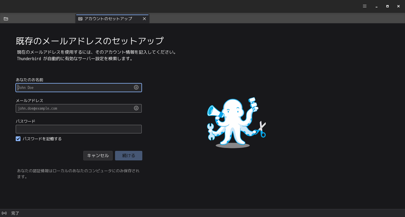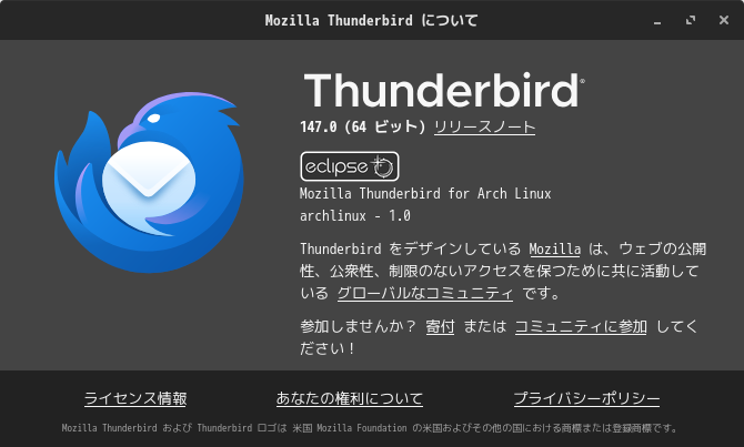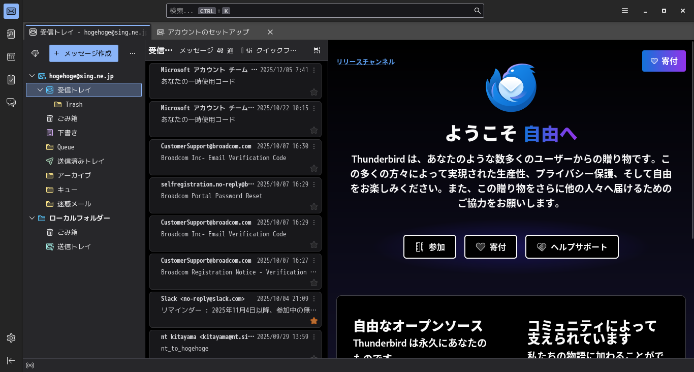 初回起動時は、「アカウント設定」が起動します。 起動直後に、受信ボックスを開いた状態です。 2026年1月28日の時点で、下記のバージョンでした。 操作方法等は「メール クライアント ソフト - Thunderbird」をご参照ください。 |