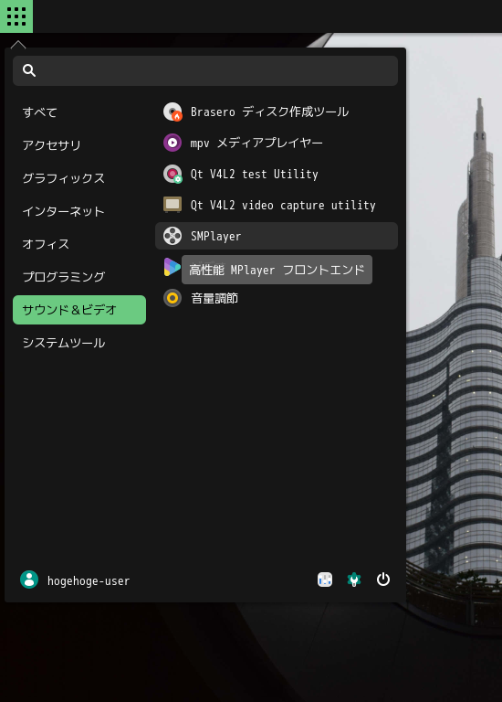 1. 概要 マルチメディアプレイヤーとして、「SMPlayer」を使用します。 2. インストール 「Pamac」で、「smplayer」を検索して、インストールします。 3. 起動 「スタート」→「マルチメディア」→「SMPlayer」