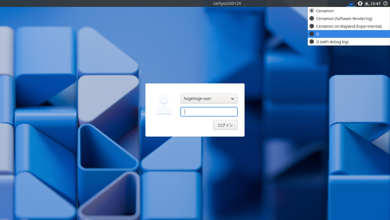 ログイン画面が表示されれば、インストールは、完了です。 ログイン時に、デスクトップ環境の選択で、「i3」を選択します。