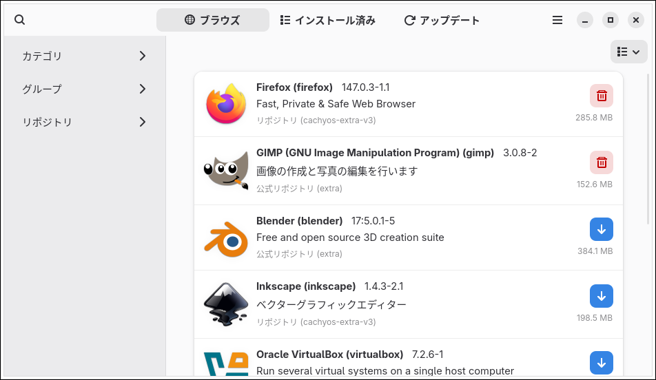 パッケージ管理フロントエンドとして「CachyOS Package Installer」と「Octopi」がデフォルトでインストールされています。