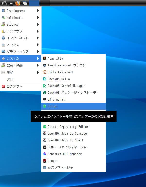 パッケージ管理フロントエンドとして「CachyOS Package Installer」と「Octopi」がデフォルトでインストールされています。