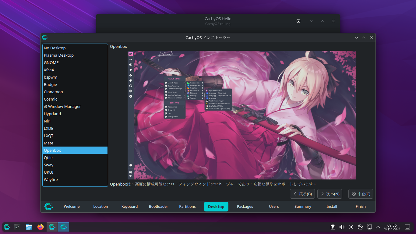 1. 概要 インストールに関しては、「CachyOS - 260124 - 共通事項」をご参照ください。 2. インストール インストール時に、デスクトップ選択画面で、「Openbox」を選択します。