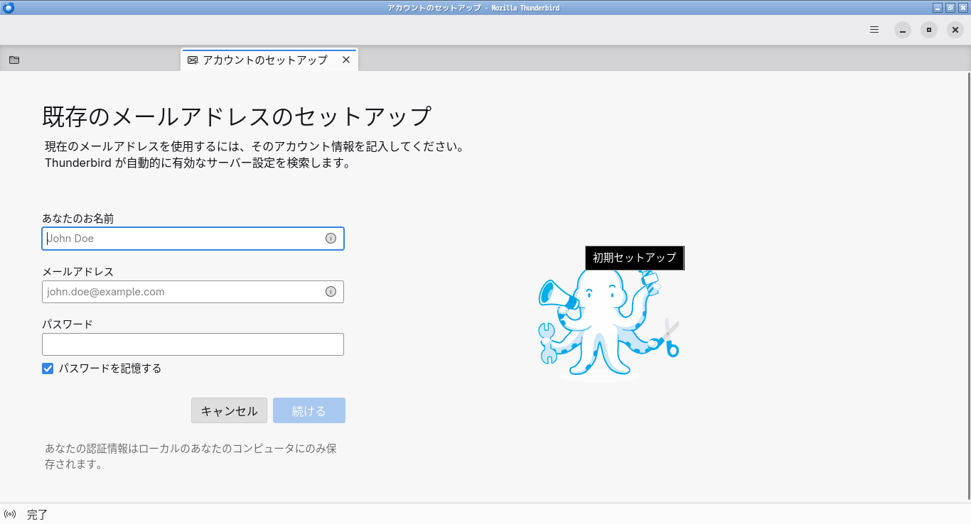 初回起動時は、「アカウント設定」が起動します。 起動直後に、受信ボックスを開いた状態です。 2026年2月2日の時点で、下記のバージョンでした。 操作方法等は「メール クライアント ソフト - Thunderbird」をご参照ください。 |