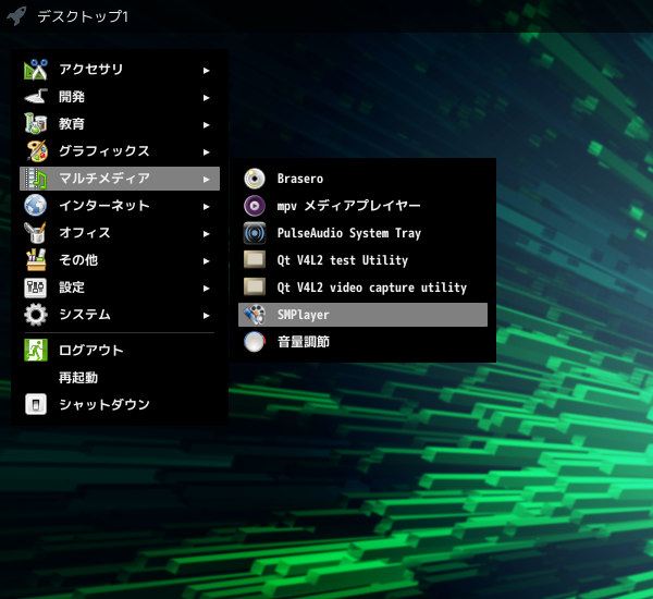 1. 概要 マルチメディアプレイヤーとして、「SMPlayer」を使用します。 2. インストール 「Octopi」で、「smplayer」を検索して、インストールします。 3. 起動 「スタート」→「マルチメディア」→「SMPlayer」