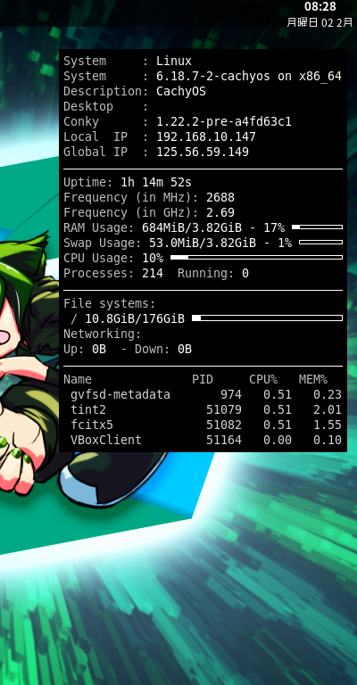 ログイン後、デスクトップ右に、「Conky」の表示が現れます。