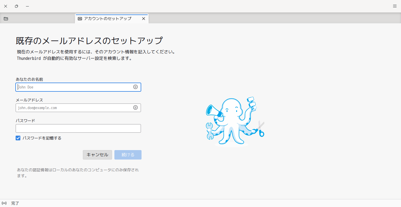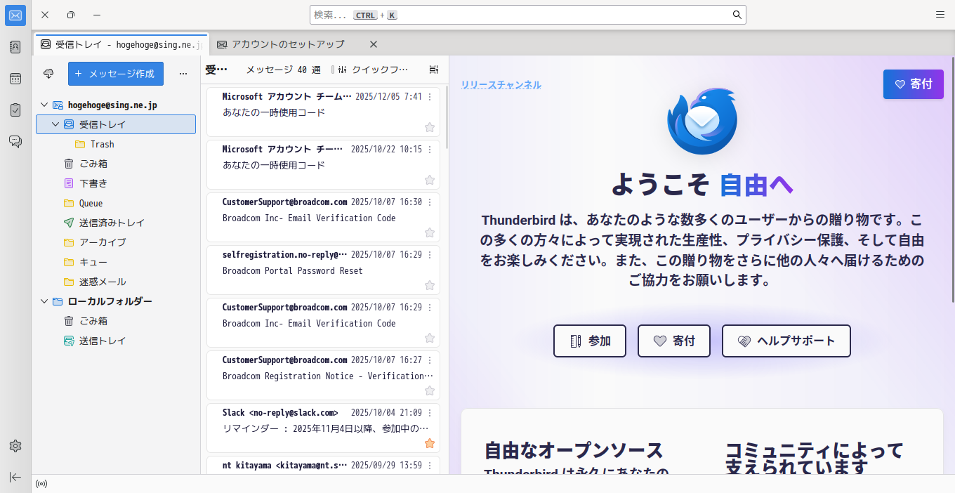 初回起動時は、「アカウント設定」が起動します。 起動直後に、受信ボックスを開いた状態です。 2026年2月5日の時点で、下記のバージョンでした。 操作方法等は「メール クライアント ソフト - Thunderbird」をご参照ください。 |