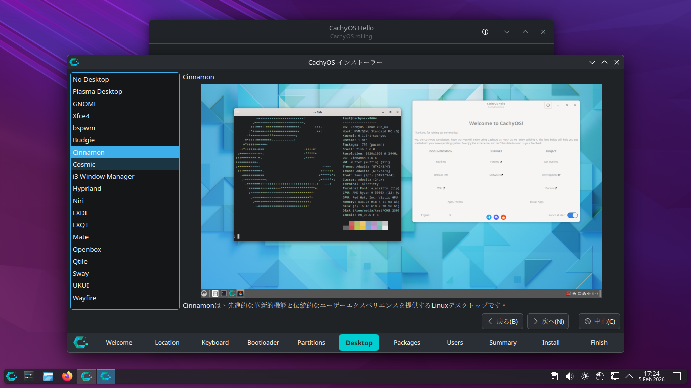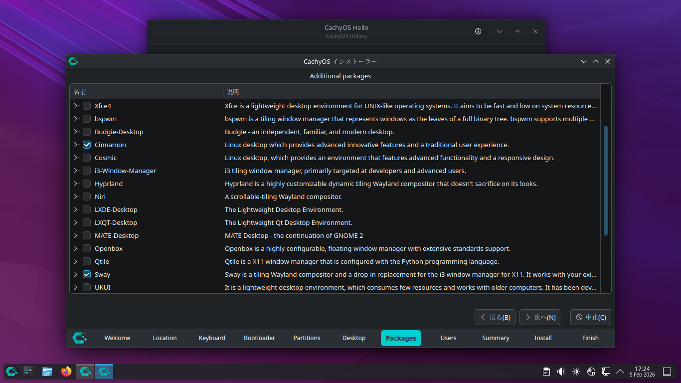 1. 概要 タイル型のデスクトップは、単独でインストールすると、再起動後にグラフィカルなログイン画面へ移行しません。 「Cinnamon」と同時にインストールして、グラフィカルな部分を「Cinnamon」へお任せします。 インストールに関しては、「CachyOS - 260124 - 共通事項」をご参照ください。 2. インストール インストール時に、デスクトップ選択画面では、「Cinnamon」を選択します。