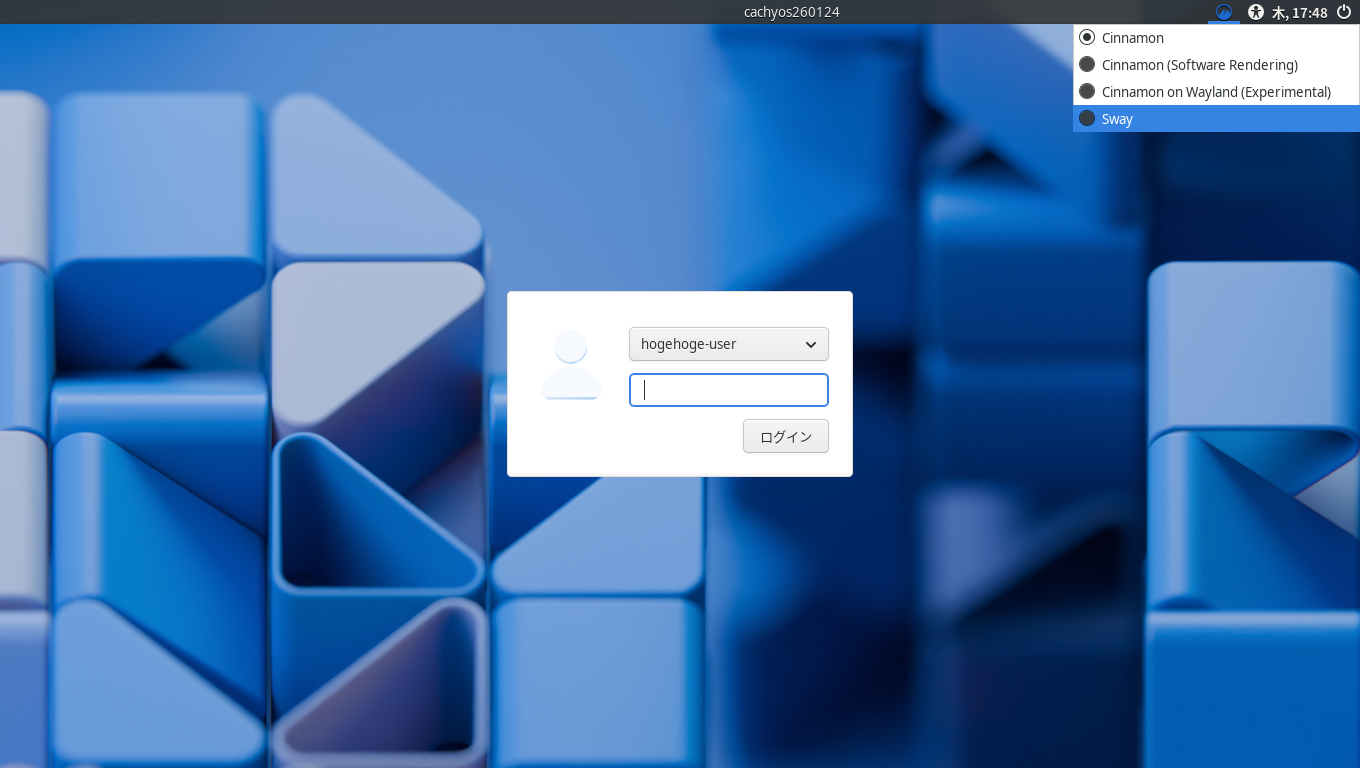 ログイン画面が表示されれば、インストールは、完了です。 ログイン時に、デスクトップ環境の選択で、「sway」を選択します。