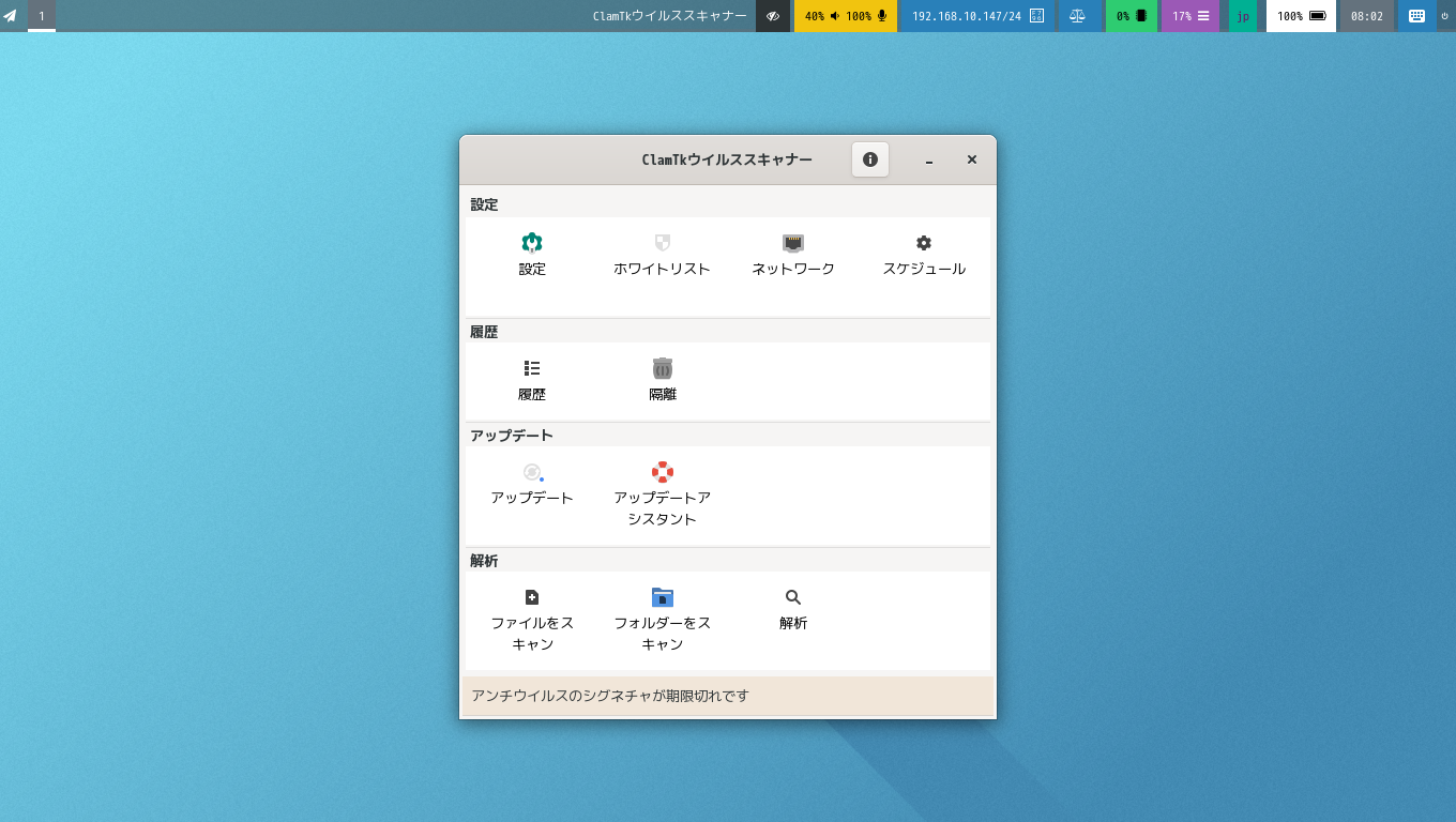 1. 概要 「ClamTk」は、「GUI」で操作するアンチウィルスソフトです。 2. インストール 「root」ユーザ権限で。 pacman -S clamtk 2回、Enter を入力します。 3. 起動 「スタート」→「アクセサリ」→「ClamTk」