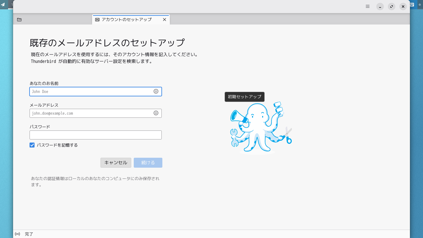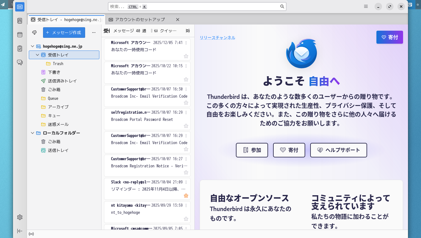 初回起動時は、「アカウント設定」が起動します。 起動直後に、受信ボックスを開いた状態です。 2026年2月9日の時点で、下記のバージョンでした。 操作方法等は「メール クライアント ソフト - Thunderbird」をご参照ください。 |