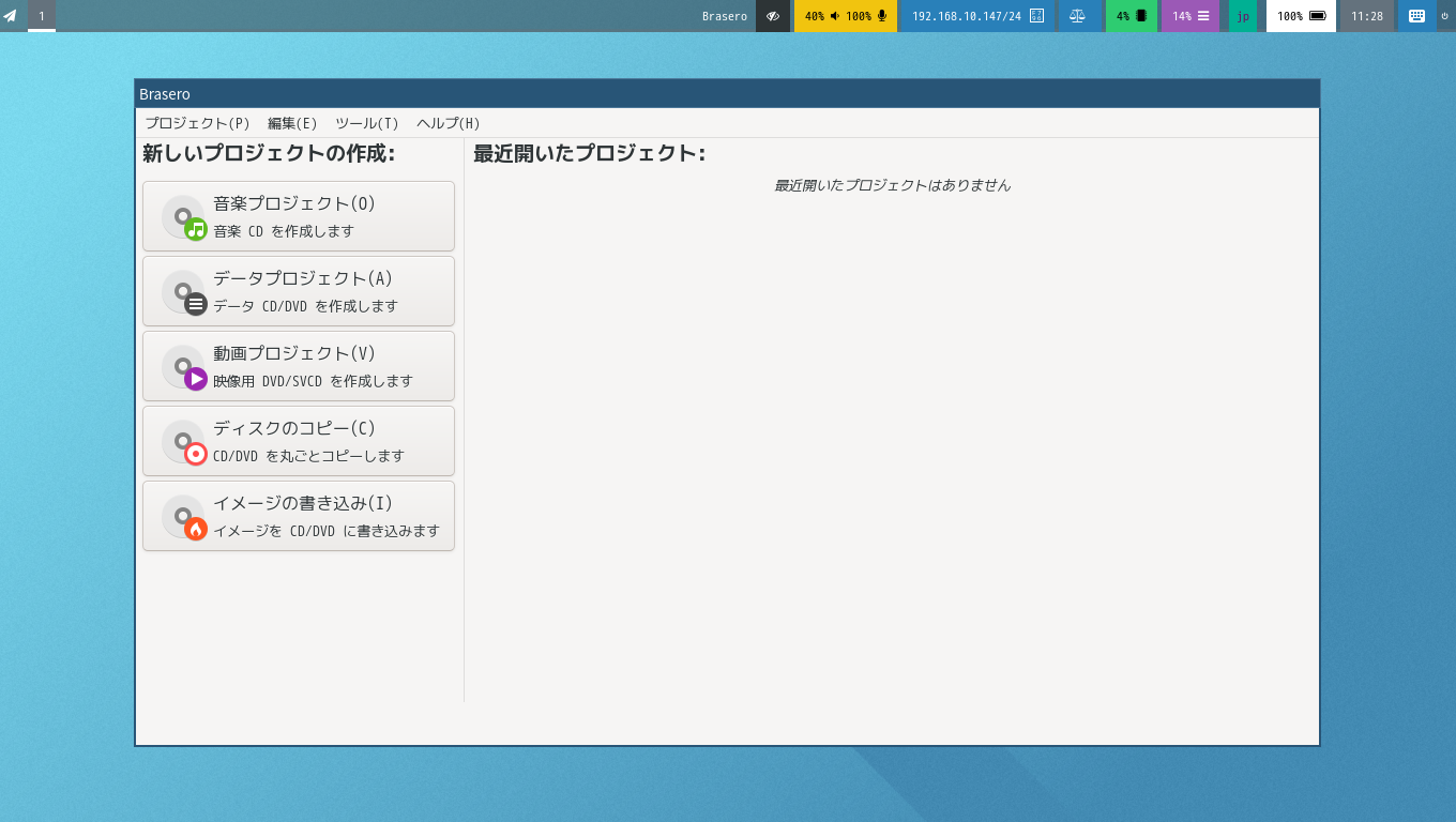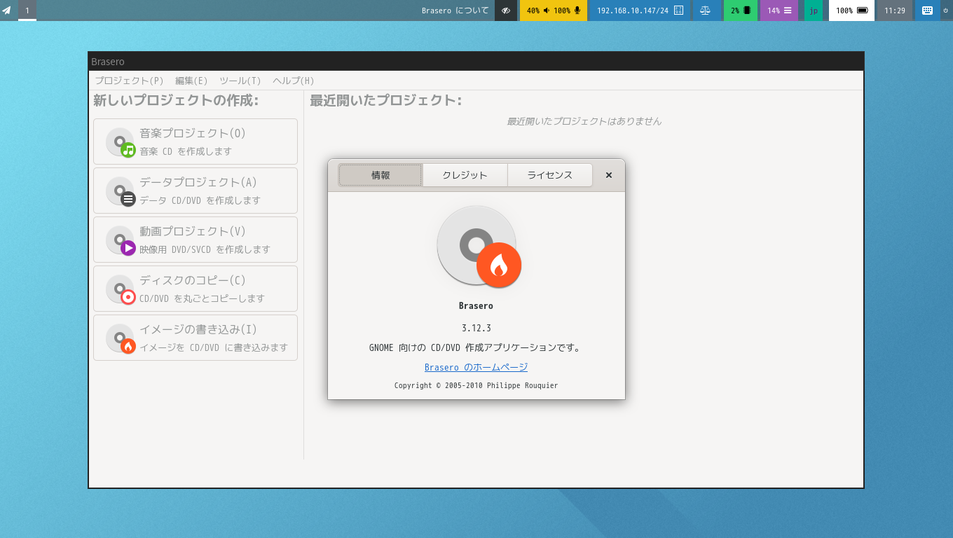 1. 概要 光ディスクライティングソフトとして、「Brasero」を使用します。 2. インストール 「root」ユーザ権限で。 yes | pacman -S brasero 3. 起動 「スタート」→「サウンドとビデオ」→「Brasero」