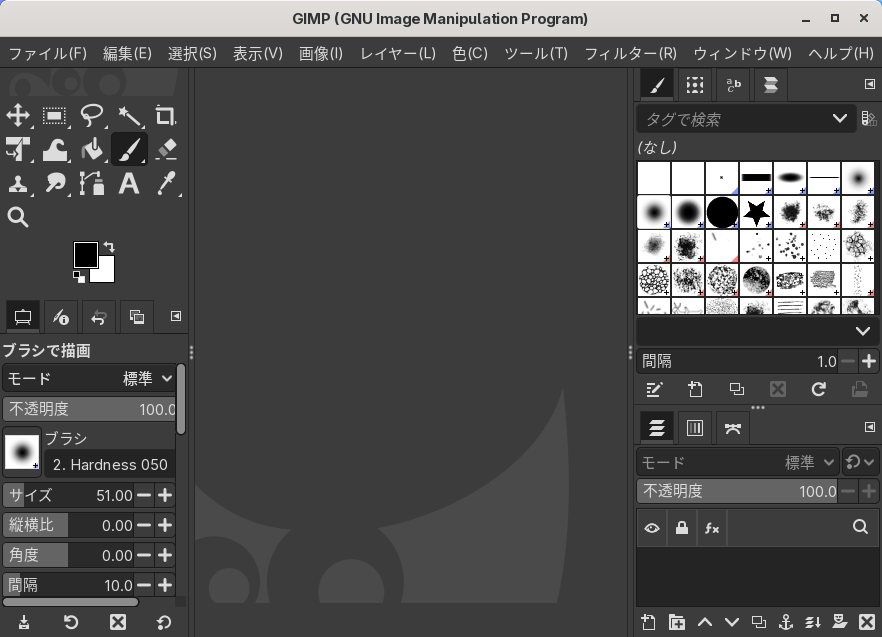 「閉じる」 起動直後の状態です。 2026年2月2日の時点で、下記のバージョンでした。 操作については、「画像編集ソフト - GIMP」に掲載しています。 上記は簡単なものですので、詳細なものがほしい方は、各所に初歩の手引きから応用編までありますので、そちらを参考にしてください。 |