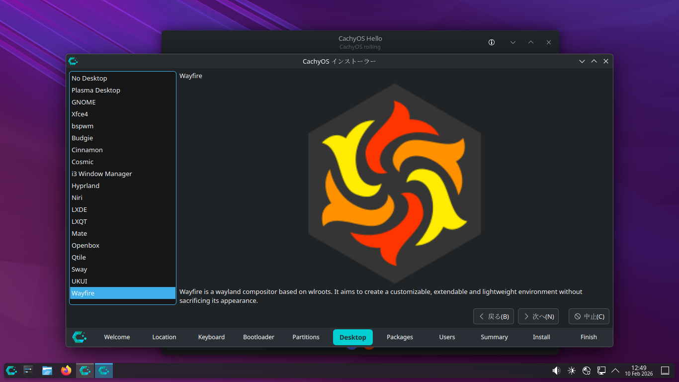 1. 概要 「WayFire」は、単独でインストールすると、再起動後にグラフィカルなログイン画面へ移行しません。 「Cinnamon」と同時にインストールして、グラフィカルな部分を「Cinnamon」へお任せします。 細かいインストール手順に関しては、「CachyOS - 260124 - 共通事項」をご参照ください。 2. インストール インストール時に、デスクトップ選択画面では、「WayFire」を選択します。