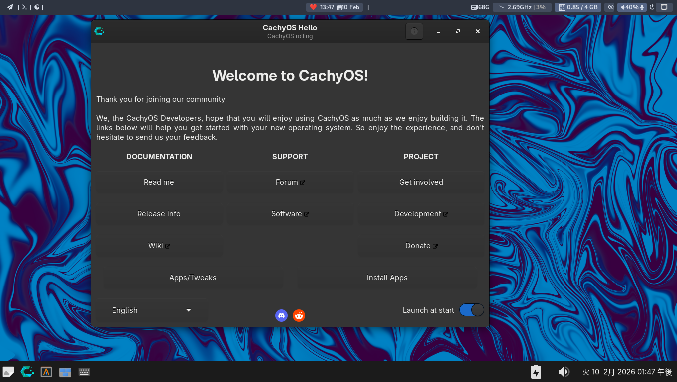 ログインするたびに「CachyOS Hello」というダイアログが表示されます。
